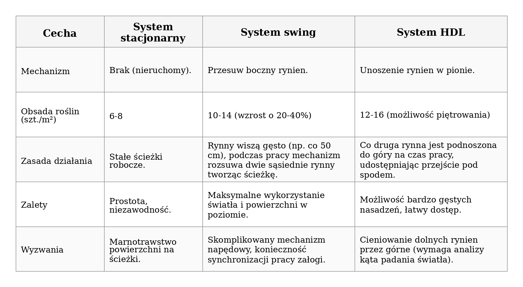 Wybór konkretnego rozwiązania konstrukcyjnego zależy od rodzaju osłony (tunel foliowy, szklarnia Venlo) oraz strategii zarządzania przestrzenią.